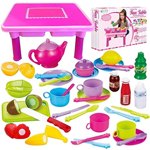 Toddler Folding Storage Table with Toy play kitchen plates and cups