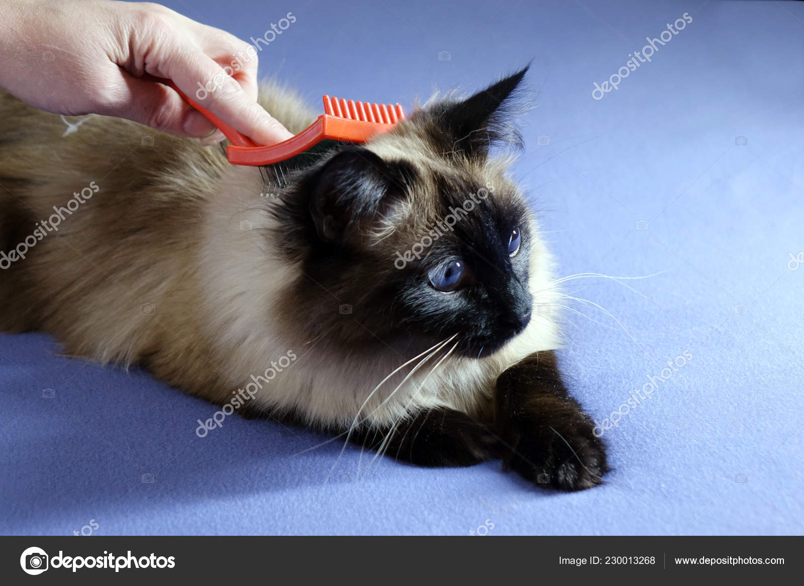 Woman Combing Her Cat`s Fur. Hair Salon furminator for ragdoll