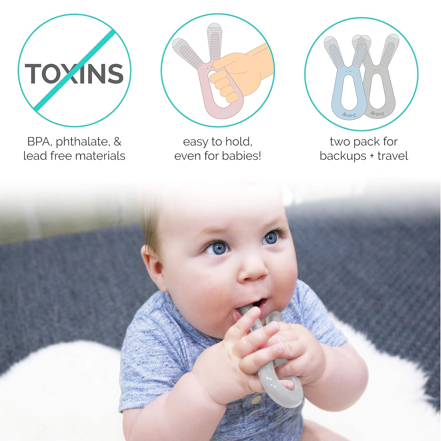 ZOLI INC Seafoam Ash Bunny Teethers, 2 zoli bunny dual nub teether