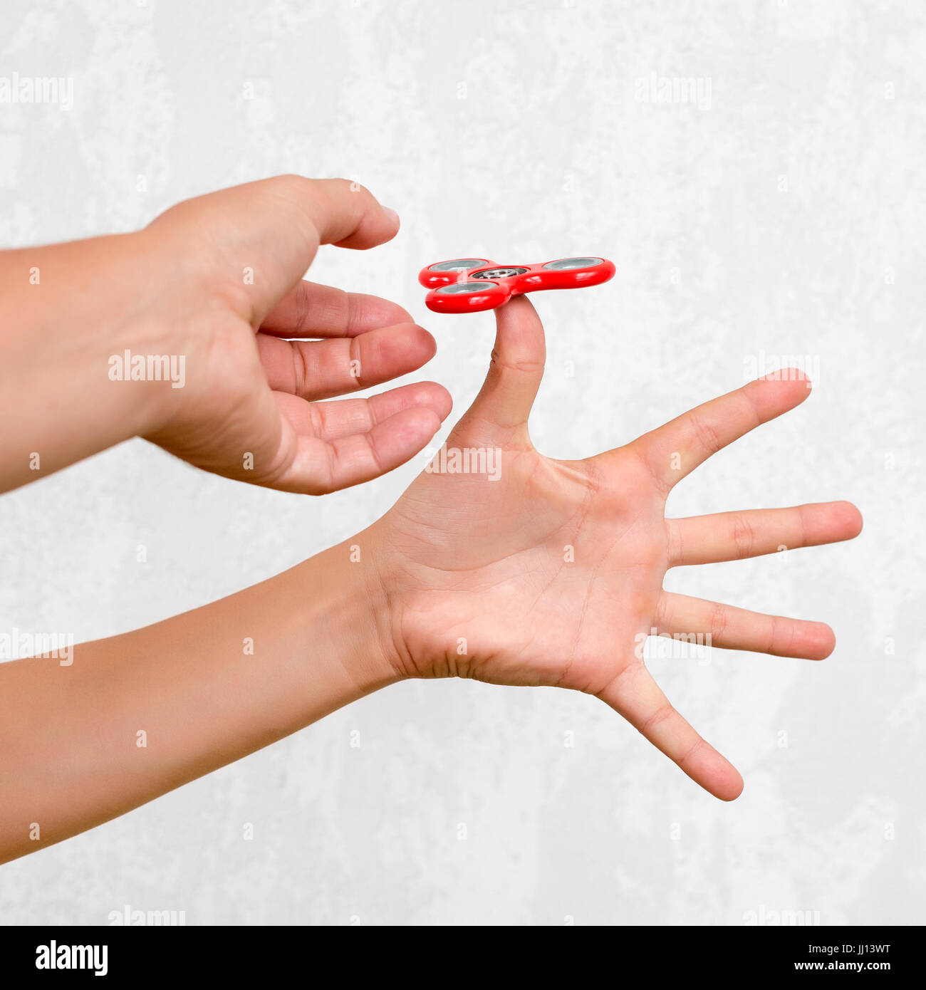 Fidget spinner. Red hand spinner, boys fidgeting hands