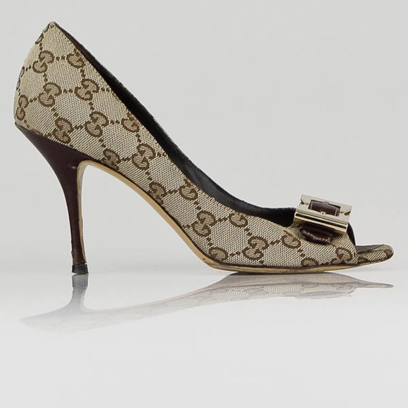 Guccibeigeebony Gg Canvas Bow Peep Toe gucci pumps with bow