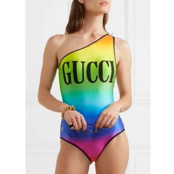 Gucci Swim | Gucci Rainbow Logo Printed gucci one shoulder swimsuit