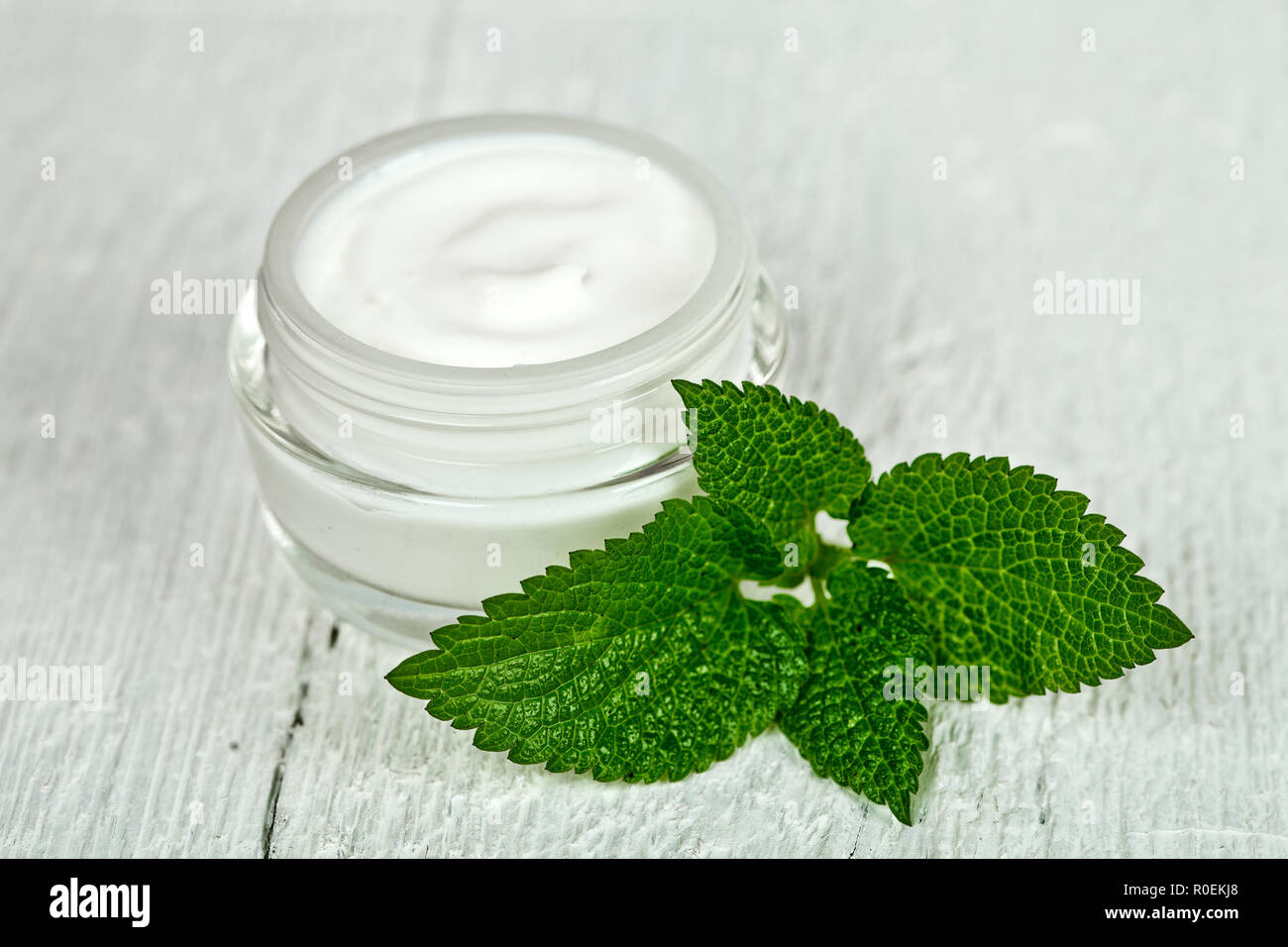 Face Cream In Glass Jar With Green Leaf green leaf face cream