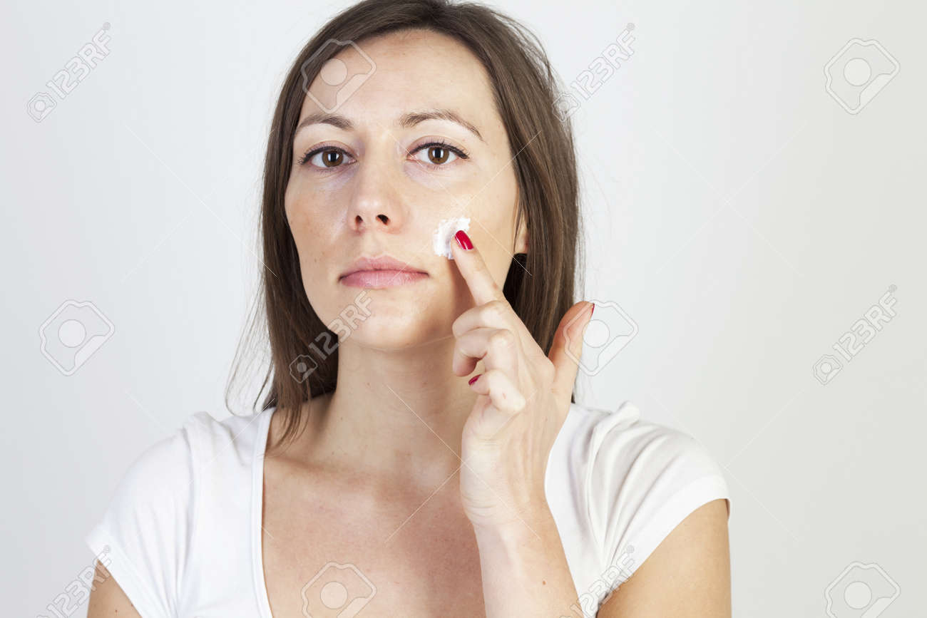 Attractive Caucasian Woman Putting putting lotion on face