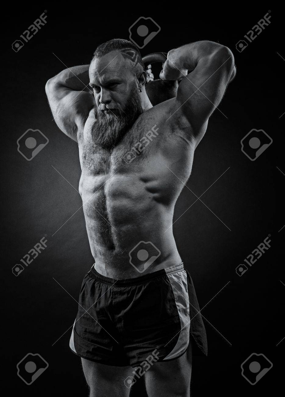 Beard Lifts A Heavy Kettlebell. Black kettlebell strongman