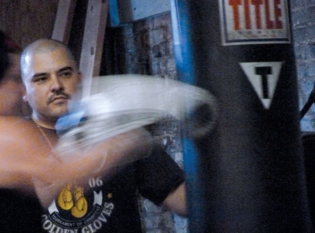 Boxing Coach Teaches Athletes Fighting headhunter boxing bag