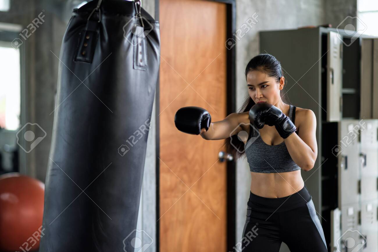 Asian Muscular Focused Woman Has Boxing punching sand