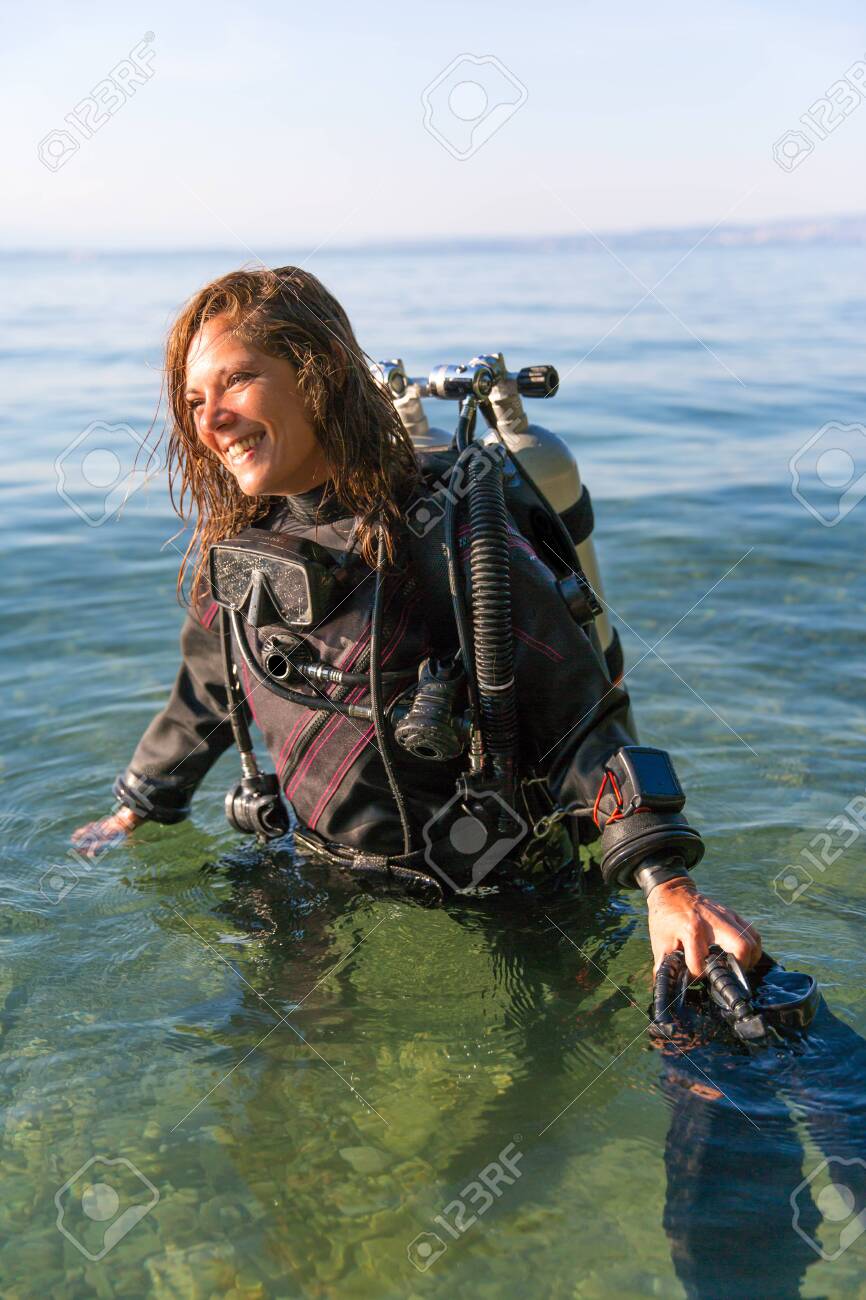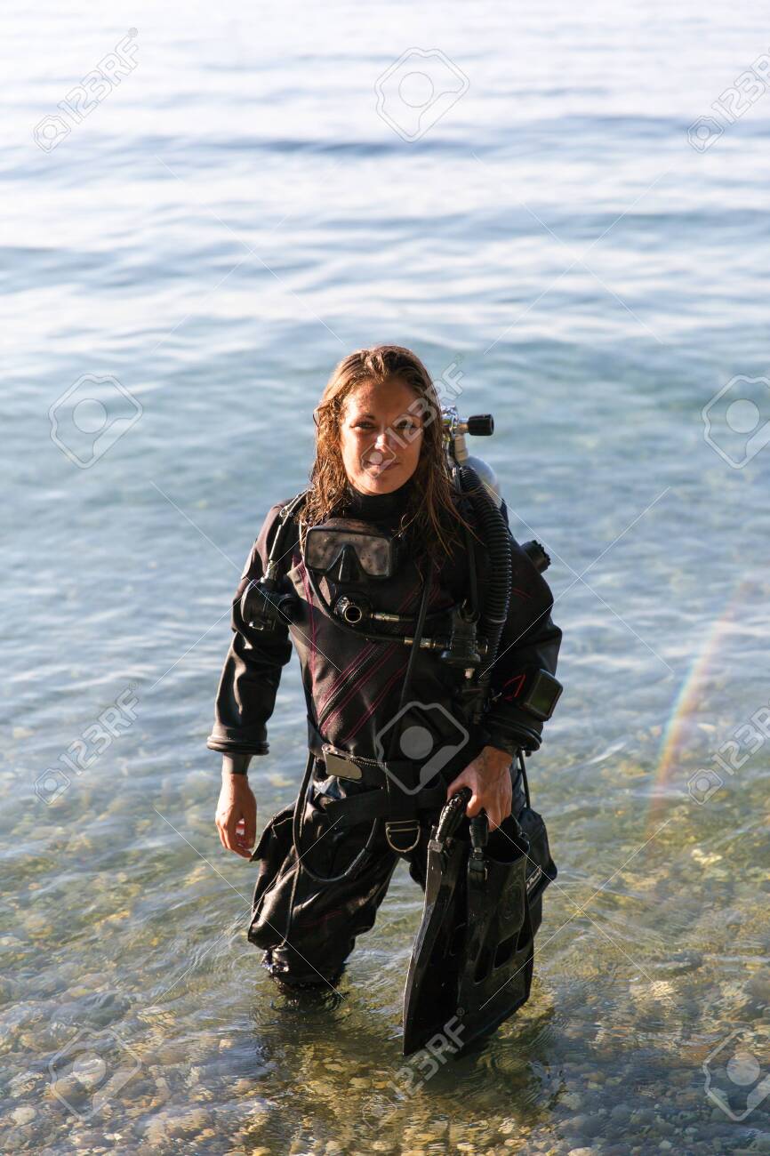 Female Scuba Diving Instructor Standing drysuit fins