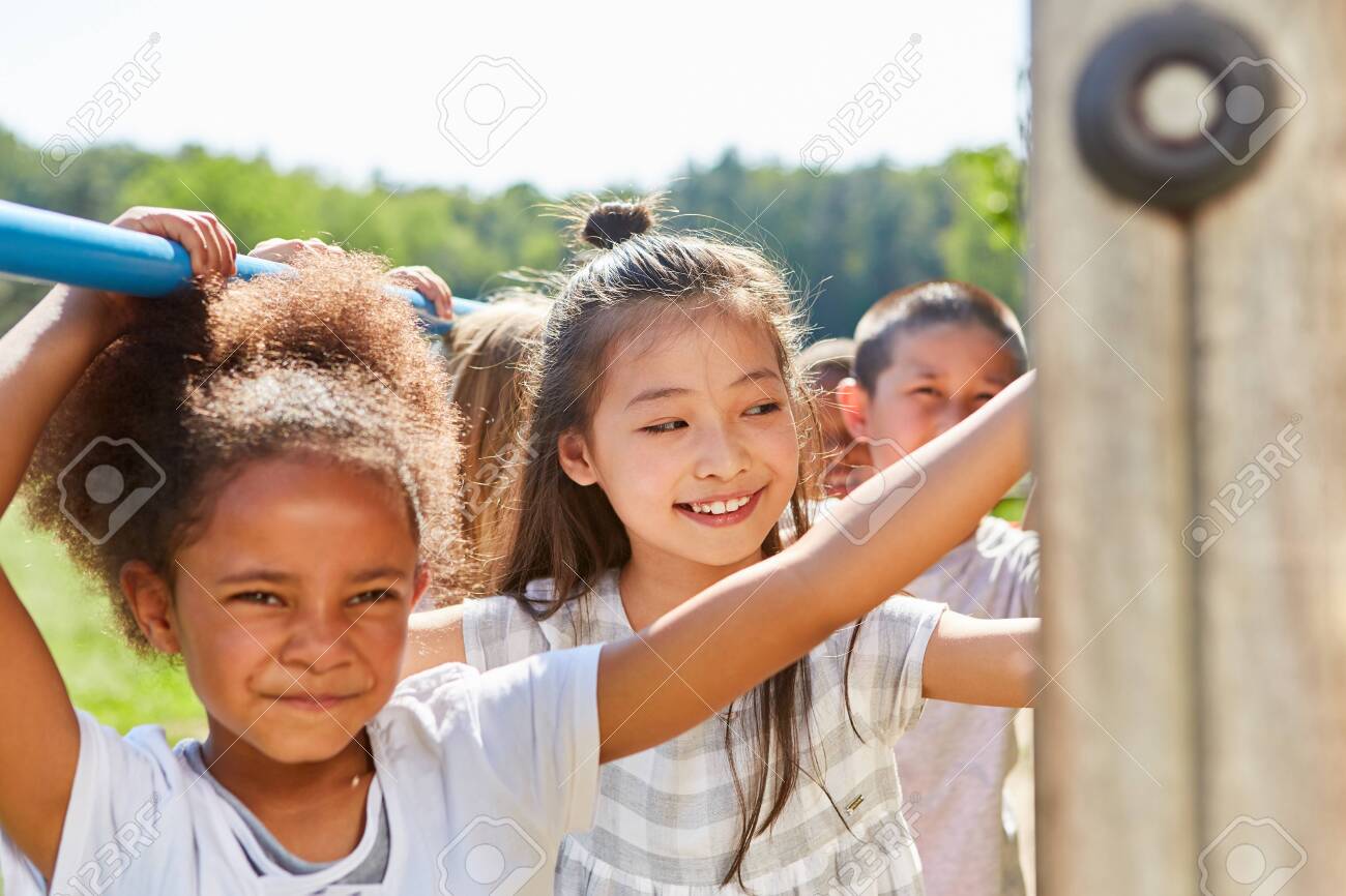 Multicultural Friends Do Gymnastics gymnastics climbing frame