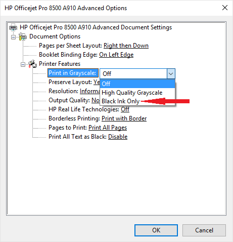 Color or Black and White Printing hp printer grayscale setting