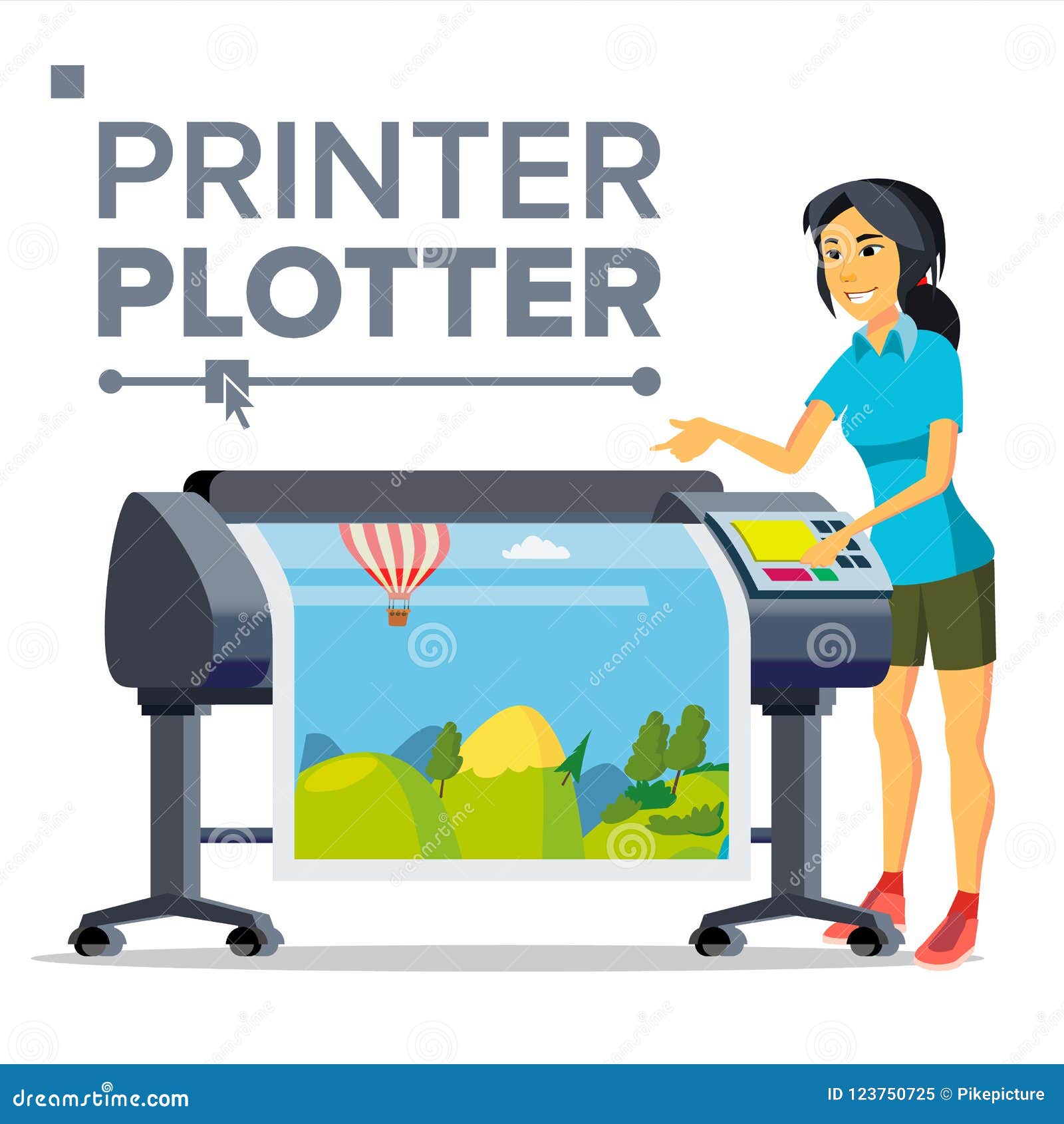Worker With Plotter Vector. Woman. Full color laser plotter